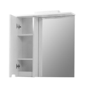 Дзеркало з шафкою серії АМЕЛІЯ шириною 65 см відмінне рішення для вашої ванної кімнати. Містка і функціональна шафка, яка розділена двома полицями з ламінованого ДСП, дає відмінну можливість зберігати невеликі за розміром речі (функціональних поличок – 3). Якісне дзеркальне полотно польського виробництва, наявність вбудованого підсвічування потужністю 3W, плавне відкриття/закриття фасаду виробу.